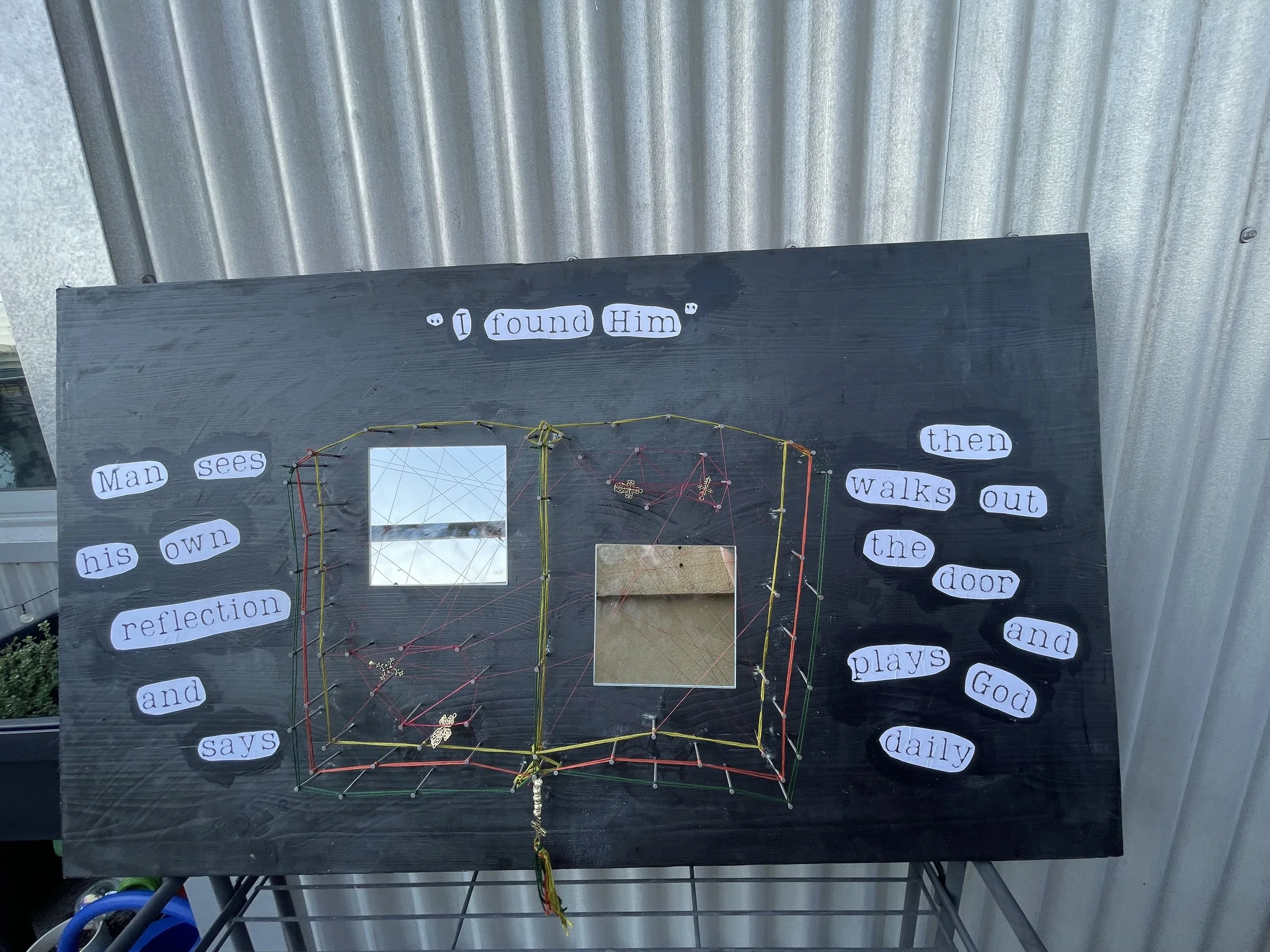 I Found Him - Wood board, collage, paint, string, nails, mirror. $300. Local pickup preferred.